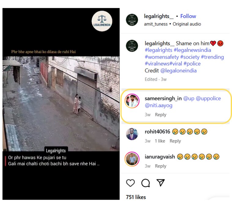 कई लोग इस वीडियो को ‘लीगल न्यूज इंडिया’, और ‘रील इंडिया’ जैसे हैशटैग के साथ शेयर कर रहे हैं और इस शख्स के खिलाफ कार्रवाई की मांग कर रहे हैं. ऐसे ही एक पोस्ट के कमेन्ट में लोग यूपी पुलिस के हैंडल को भी टैग कर रहे हैं.