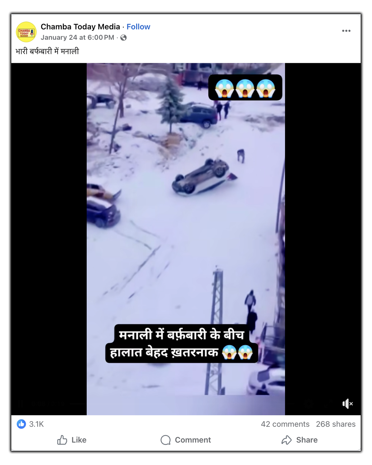 एक फेसबुक यूजर ने इस वीडियो को शेयर करते हुए लिखा, "भारी बर्फबारी में मनाली". पोस्ट का आर्काइव्ड वर्जन यहां देखा जा सकता है.