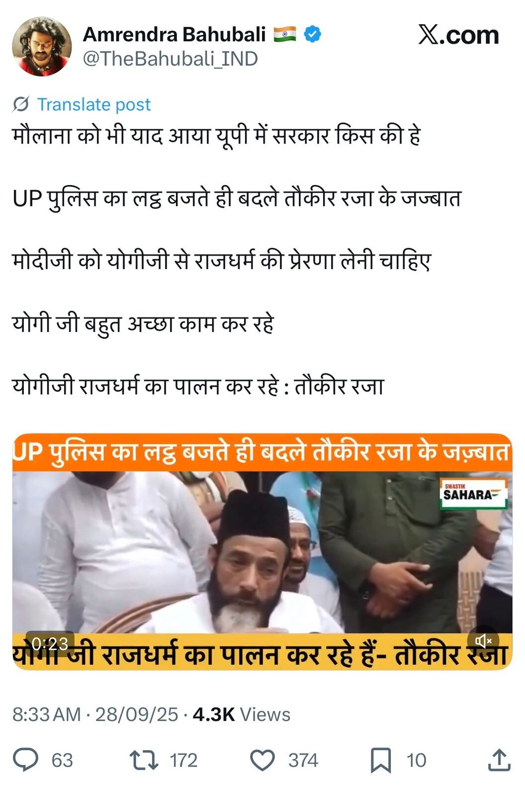 वीडियो को शेयर करते हुए एक एक्स यूजर ने लिखा है, “मौलाना को भी याद आया यूपी में सरकार किस की हे UP पुलिस का लट्ठ बजते ही बदले तौकीर रजा के जज्बात मोदीजी को योगीजी से राजधर्म की प्रेरणा लेनी चाहिए योगी जी बहुत अच्छा काम कर रहे योगीजी राजधर्म का पालन कर रहे : तौकीर रजा”