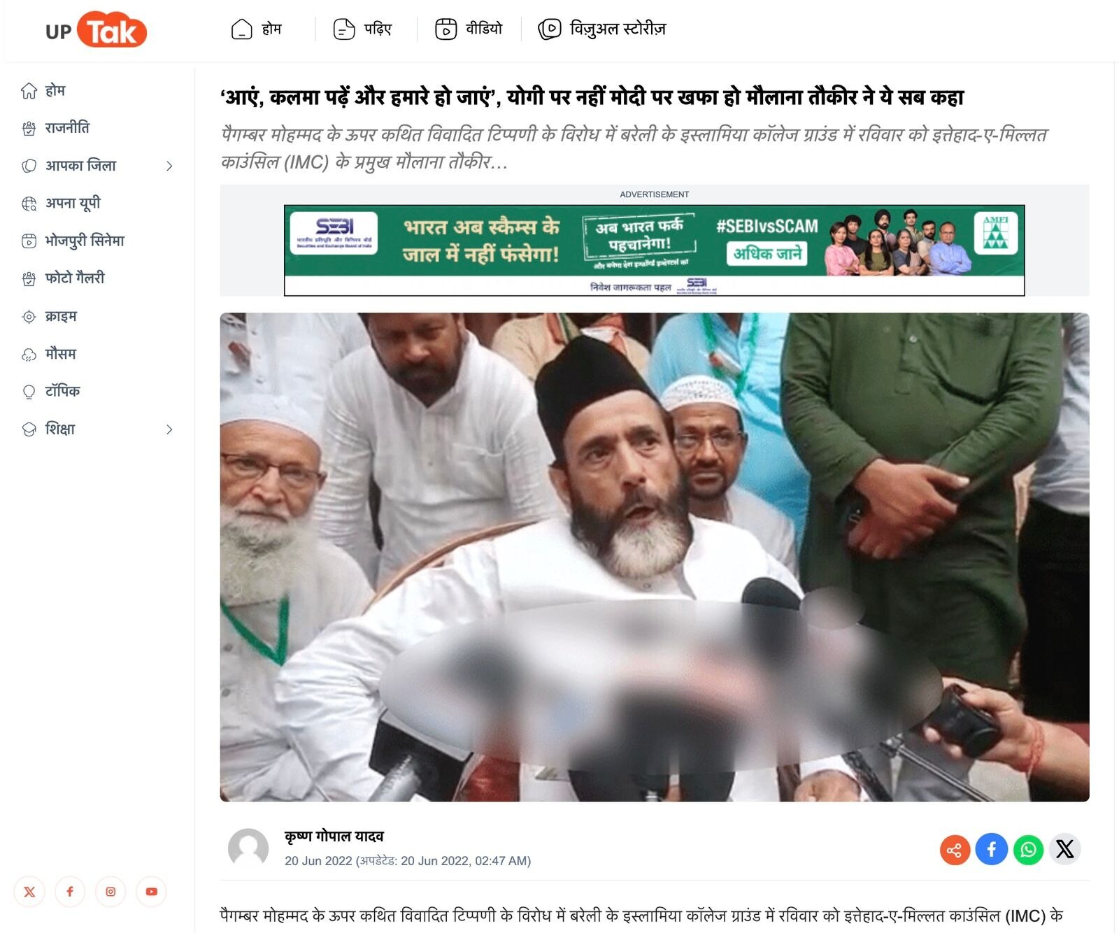 हमें इस घटना पर जून 2022 में छपी कई मीडिया रिपोर्ट्स मिलीं जिनमें वायरल वीडियो के स्क्रीनग्रैब्स को देखा जा सकता है. यूपी तक की रिपोर्ट के मुताबिक, ये वीडियो 19 जून 2022 का है जब तौकीर रजा, पैगंबर मोहम्मद पर कथित विवादित टिप्पणी के विरोध में बरेली के इस्लामिया कॉलेज ग्राउंड में 19 जून को हुए प्रदर्शन में शामिल हुए थे.