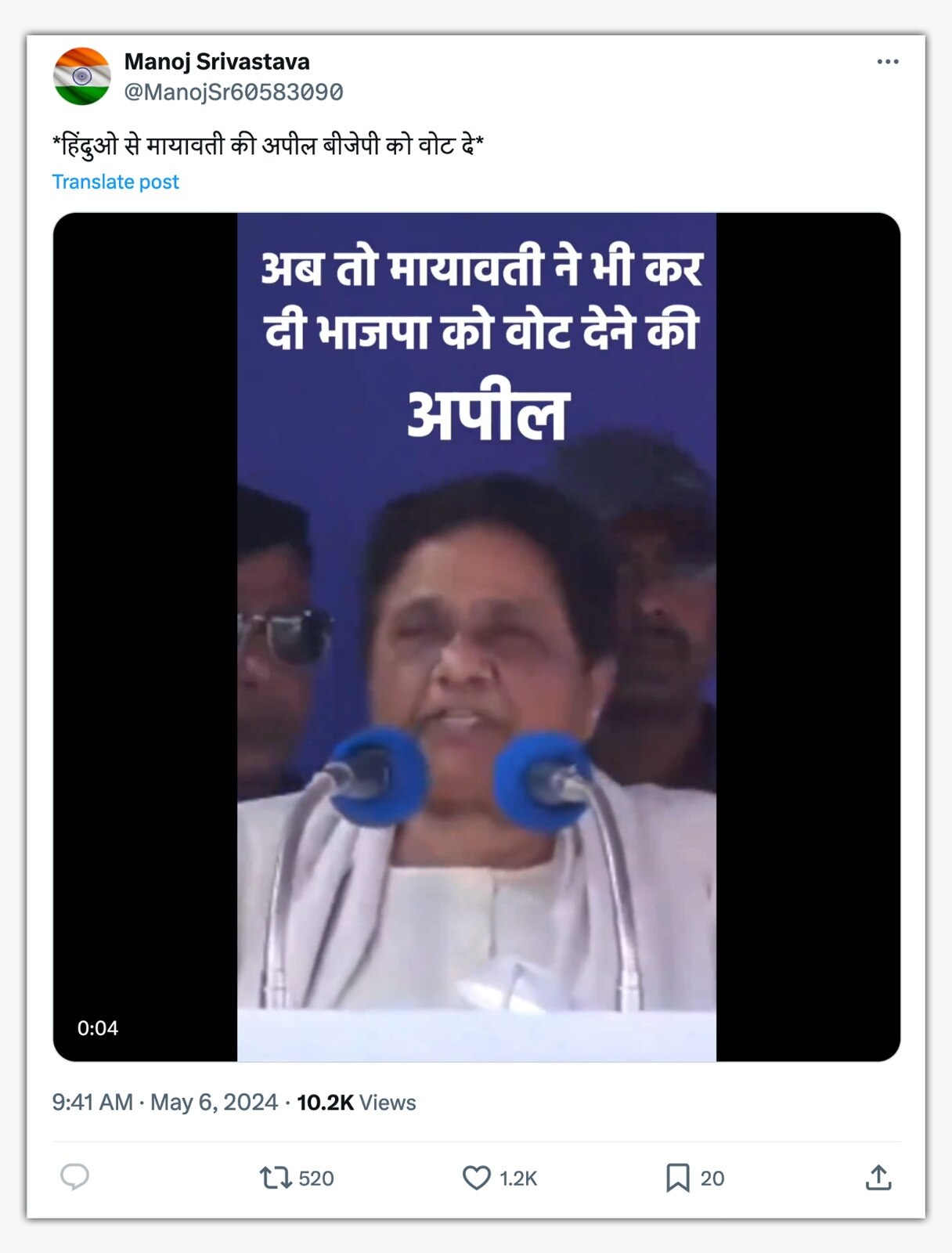 इस वीडियो में स्क्रीन पर लिखा है, “अब तो मायावती ने भी कर दी भाजपा को वोट देने की अपील” वायरल वीडियो को एक्स पर शेयर करते हुए एक यूजर ने लिखा, “*हिंदुओ से मायावती की अपील बीजेपी को वोट दे*” इस पोस्ट का आर्काइव्ड वर्जन यहां देखा जा सकता है.