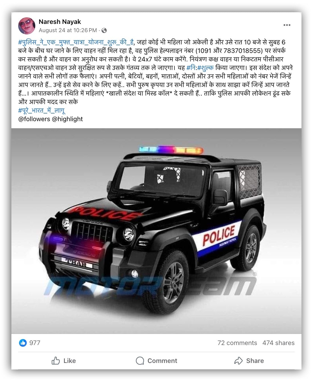 इस वायरल मैसेज में लिखा है, “पुलिस ने एक मुफ्त यात्रा योजना शुरू की है, जहां कोई भी महिला जो अकेली है और उसे रात 10 बजे से सुबह 6 बजे के बीच घर जाने के लिए वाहन नहीं मिल रहा है, वह पुलिस हेल्पलाइन नंबर (1091 और 7837018555) पर संपर्क कर सकती है और वाहन का अनुरोध कर सकती है. वे 24x7 घंटे काम करेंगे. नियंत्रण कक्ष वाहन या निकटतम पीसीआर वाहन/एसएचओ वाहन उसे सुरक्षित रूप से उसके गंतव्य तक ले जाएगा. यह नि:शुल्क किया जाएगा. इस संदेश को अपने जानने वाले सभी लोगों तक फैलाएं. अपनी पत्नी, बेटियों, बहनों, माताओं, दोस्तों और उन सभी महिलाओं को नंबर भेजें जिन्हें आप जानते हैं.. उन्हें इसे सेव करने के लिए कहें.. सभी पुरुष कृपया उन सभी महिलाओं के साथ साझा करें जिन्हें आप जानते हैं… आपातकालीन स्थिति में महिलाएं खाली संदेश या मिस्ड कॉल दे सकती हैं.. ताकि पुलिस आपकी लोकेशन ढूंढ सके और आपकी मदद कर सके पूरे भारत में लागू.”