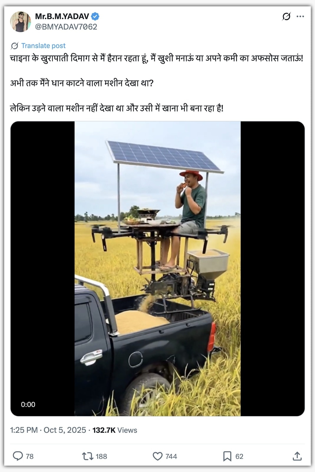 एक व्यक्ति ने लिखा, “चाइना के खुरापाती दिमाग से मैं हैरान रहता हूं, मैं खुशी मनाऊं या अपने कमी का अफसोस जताऊं! अभी तक मैंने धान काटने वाला मशीन देखा था? लेकिन उड़ने वाला मशीन नहीं देखा था और उसी में खाना भी बना रहा है!”