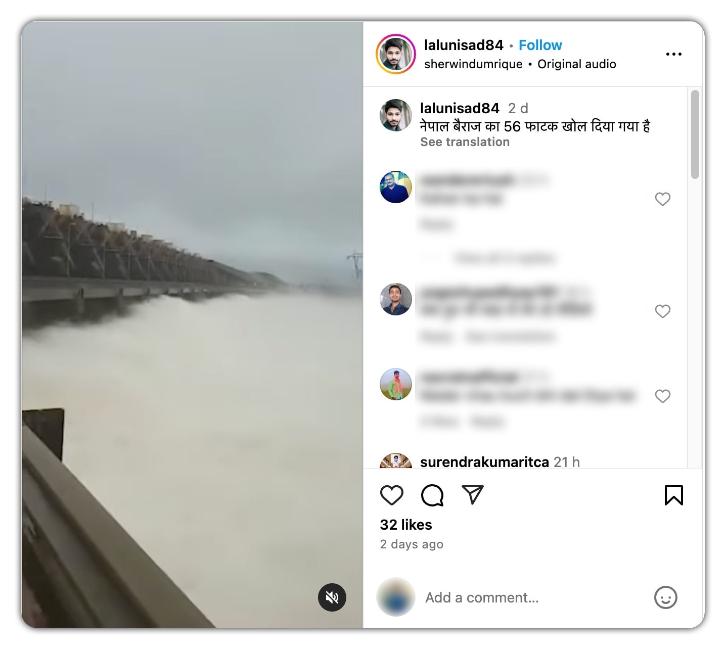 इसी बीच सोशल मीडिया पर एक बांध का एक वीडियो वायरल हो गया है, जिसे कोसी बैराज का हालिया दृश्य बताया जा रहा है. वीडियो में बांध के फाटक से ढेर सारा पानी निकलने के बावजूद, बांध की दूसरी ओर से पानी ओवरफ्लो होकर आ रहा है. इसे इंस्टाग्राम पर शेयर करते हुए एक व्यक्ति ने लिखा, “नेपाल बैराज का 56 फाटक खोल दिया गया है.”