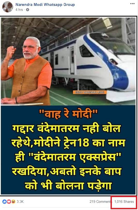 भारतीय रेलवे की सबसे तेज़ रफ्तार बिना इंजन की ट्रेन (ट्रेन 18) का नाम बदलने से जुड़ी फेसबुक पोस्ट सोशल मीडिया पर खूब शेयर की जा रही है. पोस्ट में किए दावे के मुताबिक प्रधानमंत्री नरेंद्र मोदी ने सुनिश्चित किया कि ट्रेन का नाम बदल कर ‘वंदे मातरम एक्सप्रेस’ रखा जाए जिससे कि ‘देशद्रोही’ जो इन शब्दों को बोलने से हिचकते हैं, वो भी इन्हें बोलने को मजबूर हो जाएं.