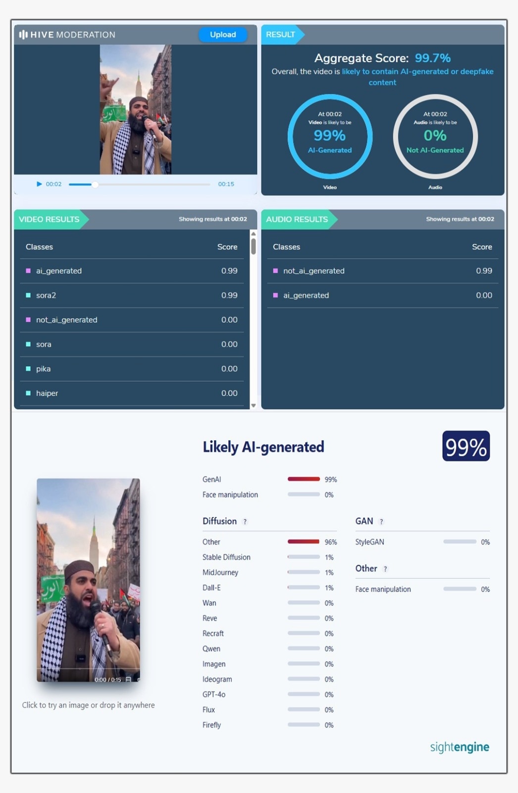 इसके बाद हमने वायरल वीडियो और इसके अलग-अलग फ्रेम्स को AI डिटेक्शन टूल्स की मदद से सर्च किया. ‘Hive Moderation’ और ‘Sightengine’ दोनों ही टूल्स ने वीडियो को 99 फीसदी AI से बना हुआ बताया.