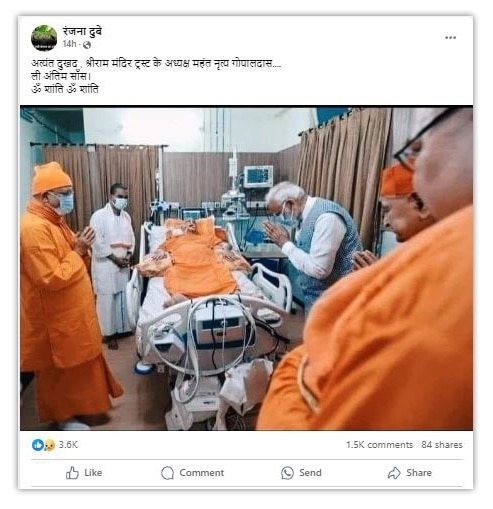मिसाल के तौर पर, इस तस्वीर को शेयर करते हुए कुछ लोगों ने फेसबुक पर लिखा, "अत्यंत दुखद, श्रीराम मंदिर ट्रस्ट के अध्यक्ष महंत नृत्य गोपालदास.... ली अंतिम साँस. ॐ शांति ॐ शांति."