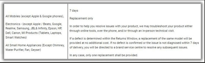 इन प्लेटफॉर्म्स के रिटर्न/रिप्लेसमेंट पॉलिसी पेज पर उत्पादों को अलग-अलग श्रेणियों में बांटा गया है. कुछ एक अपवादों और कुछ विशेष कंपनियों के उत्पादों को छोड़कर, बाकी इलेक्ट्रॉनिक उपकरणों को ई-कॉमर्स वेबसाइट के जरिये ही रिटर्न या रिप्लेस किया जा सकता है.