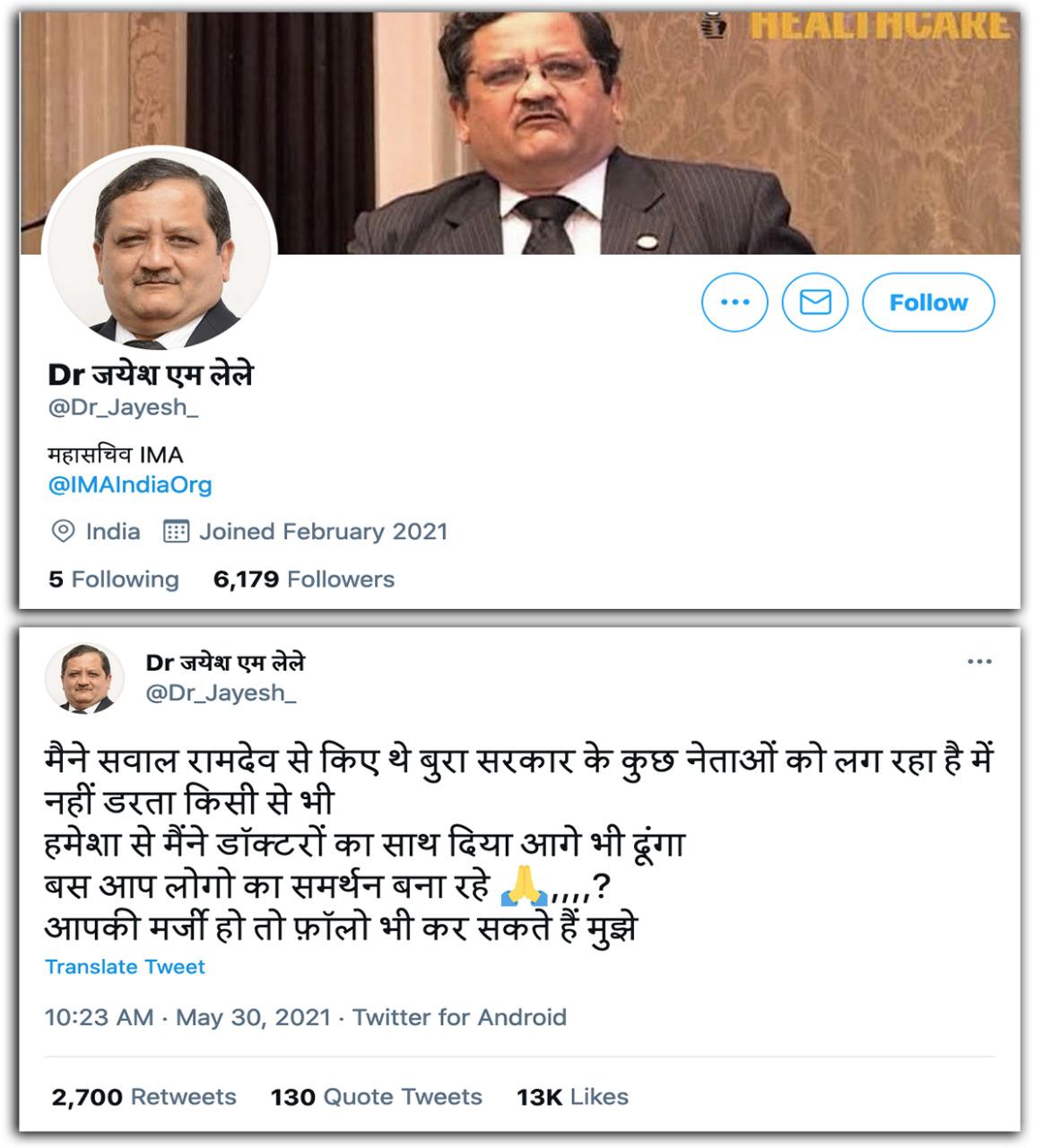 अब इसी के मद्देनजर ट्विटर पर डॉ लेले का एक कथित ट्वीट जमकर वायरल हो रहा है. इस ट्वीट के मुताबिक, डॉ लेले ने कहा है कि उन्होंने सवाल रामदेव से किये थे लेकिन बुरा सरकार के कुछ मंत्रियों को लग रहा है. "Dr जयेश एम लेले" नाम के अकाउंट से किये गए इस ट्वीट को 13000 से भी ज्यादा बार लाइक किया जा चुका है. डॉ लेले का आधिकारिक ट्विटर अकाउंट समझकर यूजर्स इस ट्वीट पर अपनी प्रतिक्रिया दे रहे हैं. अभी तक 6000 से भी ज्यादा यूजर्स इस अकाउंट को फॉलो कर चुके हैं. इस ट्विटर प्रोफाइल से किये गए कुछ अन्य ट्वीट्स भी काफी वायरल हैं. खास बात ये कि इस प्रोफाइल से सिर्फ रामदेव नहीं बल्कि बीजेपी नेताओं पर भी निशाना साधा जा रहा है.