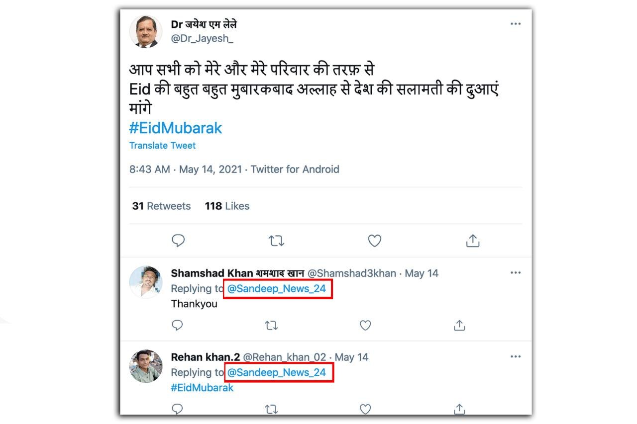 सबसे पहले हमने इस अकाउंट (Dr_Jayesh_) के कुछ पुराने ट्वीट्स की पड़ताल की. इन्हीं में से हमें एक ट्वीट मिला. जिसे इस अकाउंट से 14 मई 2021 को पोस्ट किया गया था. इस ट्वीट में गौर करने वाली बात ये थी कि कमेंट की टैग वाली जगह पर "Dr_Jayesh_" की जगह "Sandeep_News_24" नाम का हैंडल दिख रहा था.