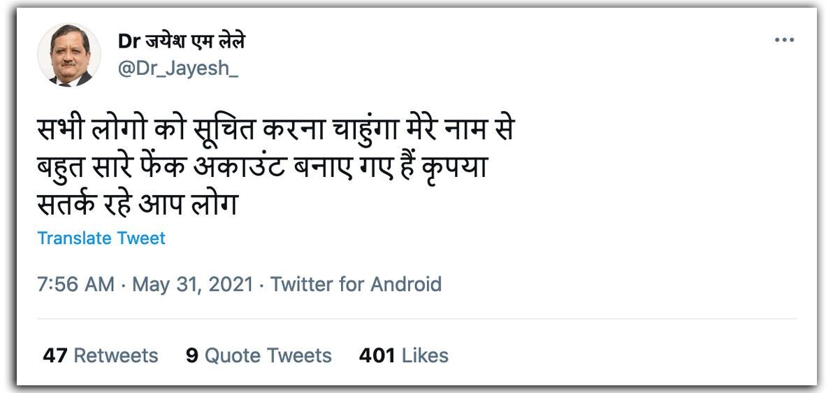 इसके साथ ही, लोगों को और भ्रमित करने के लिए अकाउंट से ये ट्वीट भी किया गया है कि डॉ लेले के कई फेक अकाउंट बनाये गए हैं और इनसे सतर्क रहें. लेकिन असलियत में ये अकाउंट खुद भी नकली है.