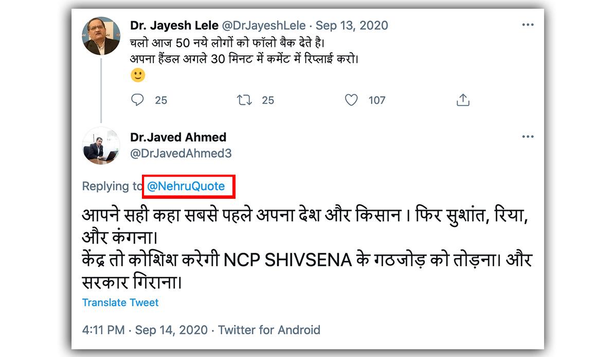 खोजने पर पता चला कि ये अकाउंट को पहले "NehruQuote" नाम के हैंडल पर बनाया गया था. बाद में भ्रम फैलाने के लिए हैंडल का नाम "DrJayeshLele" कर दिया गया.