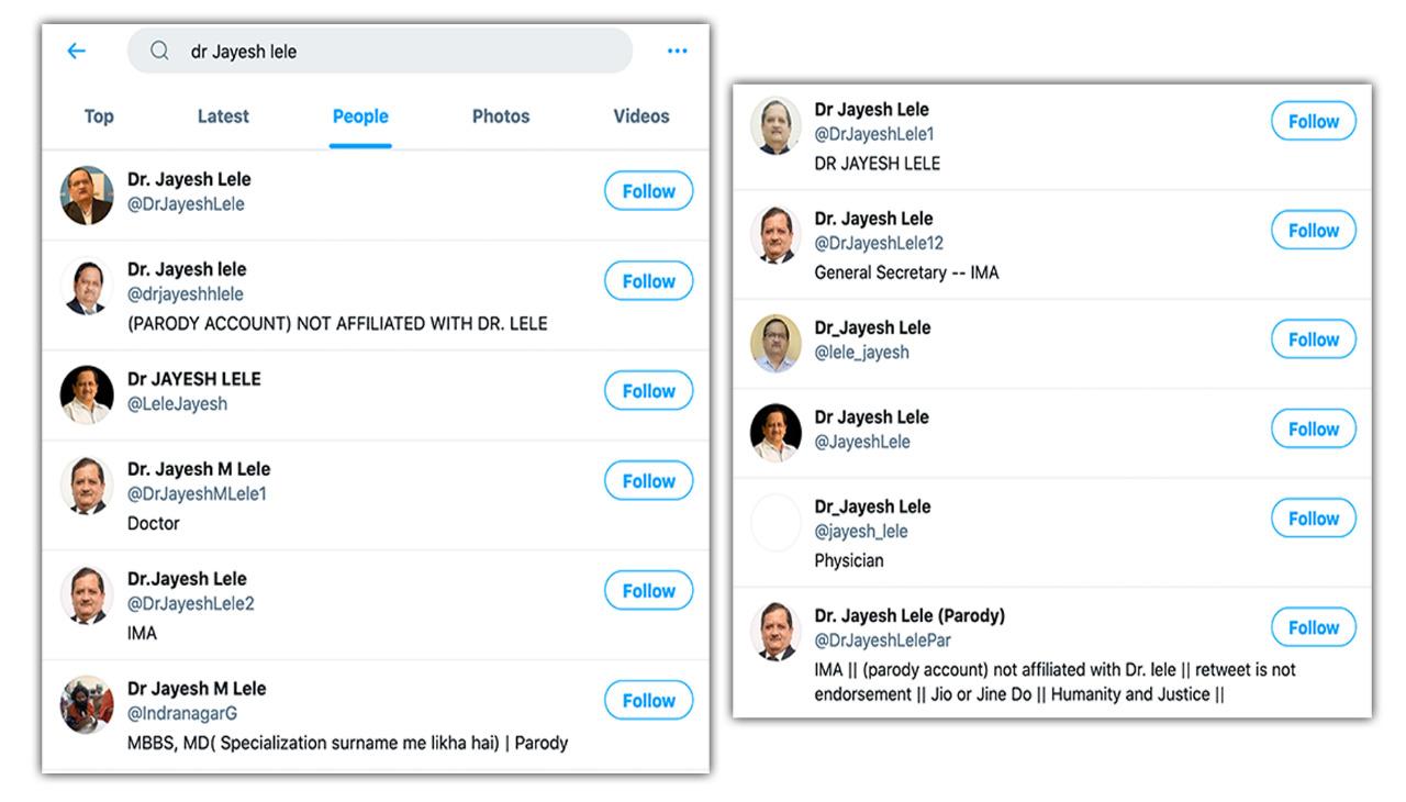 बाबा रामदेव से हुई नोकझोंक के बाद से डॉ लेले के नाम पर कई अकाउंट बनाये जा चुके हैं. हालांकि कुछ ट्विटर बायो में पैरोडी अकाउंट होने की बात लिखी है लेकिन कुछ ऐसे भी हैं जो डॉ लेले का असली अकाउंट दिखने की कोशिश कर रहे हैं.