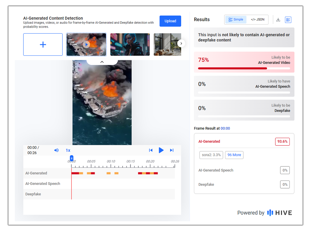 हमने हाइव मॉडरेशन नाम के एआई डिटेक्टर टूल से भी इस वीडियो की जांच की. टूल ने इसके एआई से बने होने की 75 प्रतिशत संभावना जताई.