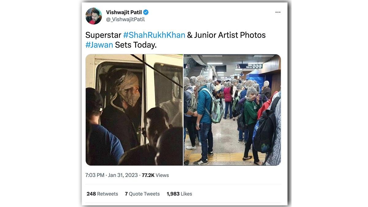 फिल्म समीक्षक और ट्रेड ऐनालिस्ट विश्वजीत पाटिल ने भी ऐसे ही दावे के साथ ये तस्वीरें ट्विटर पर शेयर कीं. तस्वीरें पोस्ट करते हुए उन्होंने लिखा, “जवान के सेट पर सुपरस्टार शाहरुख खान और जूनियर आर्टिस्ट्स की आज की तस्वीर”. इस ट्वीट का आर्काइव्ड वर्जन यहां देखा जा सकता है.