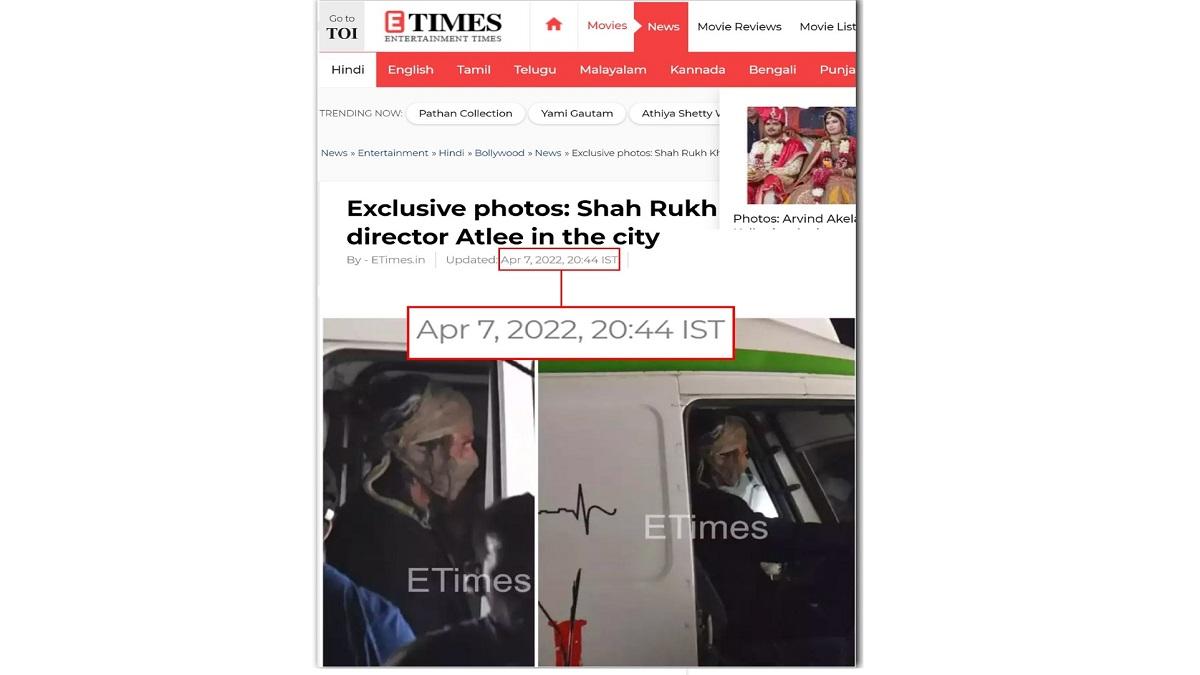 रिवर्स सर्च करने पर शाहरुख खान की बैन्डेज वाली तस्वीर हमें सात अप्रैल 2022 को छपी 'एंटरटेन्मेंट टाइम्स' की एक रिपोर्ट में मिली. इस रिपोर्ट में बताया गया है कि शाहरुख ने एटली के निर्देशन में बन रही अगली फिल्म की शूटिंग शुरू की. रिपोर्ट में वायरल फोटो से मिलती-जुलती अन्य तस्वीरें भी हैं. इसमें बताया गया है कि ये तस्वीरें फोटोग्राफर हिमांशु शिंदे ने ली थीं.