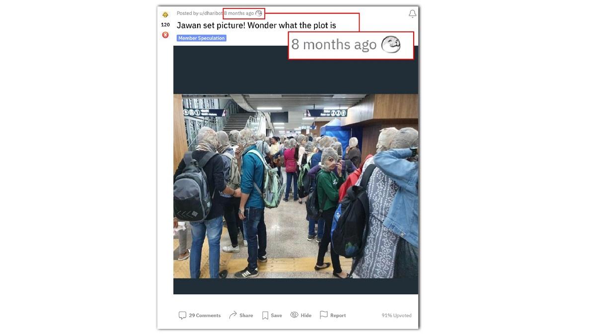 रिवर्स सर्च करने पर दूसरी तस्वीर हमें 'Reddit' पर चार जून 2022 को प्रकाशित एक पोस्ट में मिली. इसके कैप्शन में अंग्रेजी में लिखा था, “जवान के सेट की तस्वीर! सोचो इसकी कहानी क्या होगी.”