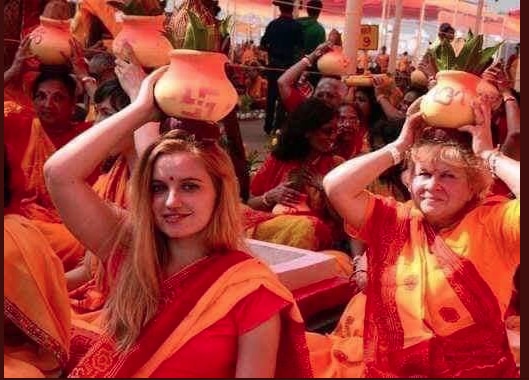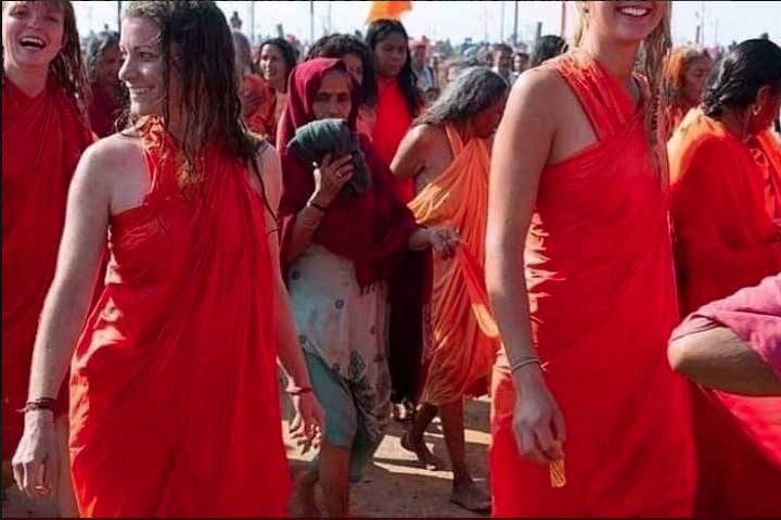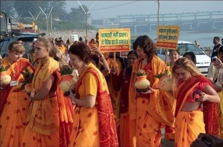हेशटैग #KumbhMela से ट्विटर यूजर @KrrishYadhu ने प्रयागराज में चल रहे कुंभ की तस्वीरों का एक कोलाज पोस्ट किया जो सोशल मीडिया पर वायरल हो गया. इस पोस्ट में विदेशियों की तीन तस्वीरें हैं जिसमें वे परंपरागत भारतीय परिधानों में हिन्दू रीति-रिवाजों को पूरा करते नजर आ रहे हैं. पोस्ट में तस्वीरों के साथ लिखा गया है- 'प्रिय मिशनरियों, यहां देखो...हमने लोगों को जबरन धर्म परिवर्तन के लिए कोई किताब या पैसा नहीं दिया...हिन्दुत्व आपकी कल्पना से बाहर है...#KumbhMela.'