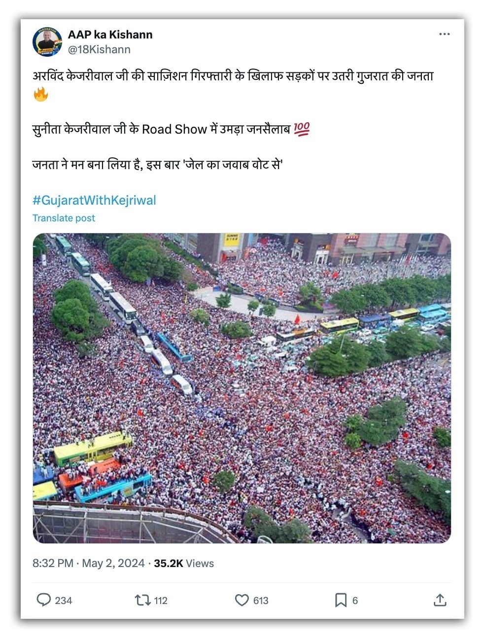 एक ‘एक्स’ यूजर ने वायरल तस्वीर को शेयर करते हुए लिखा, “अरविंद केजरीवाल जी की साज़िशन गिरफ्तारी के खिलाफ सड़कों पर उतरी गुजरात की जनता सुनीता केजरीवाल जी के Road Show में उमड़ा जनसैलाब. जनता ने मन बना लिया है, इस बार 'जेल का जवाब वोट से'.” ऐसे ही एक पोस्ट का आर्काइव्ड वर्जन यहां देखा जा सकता है.