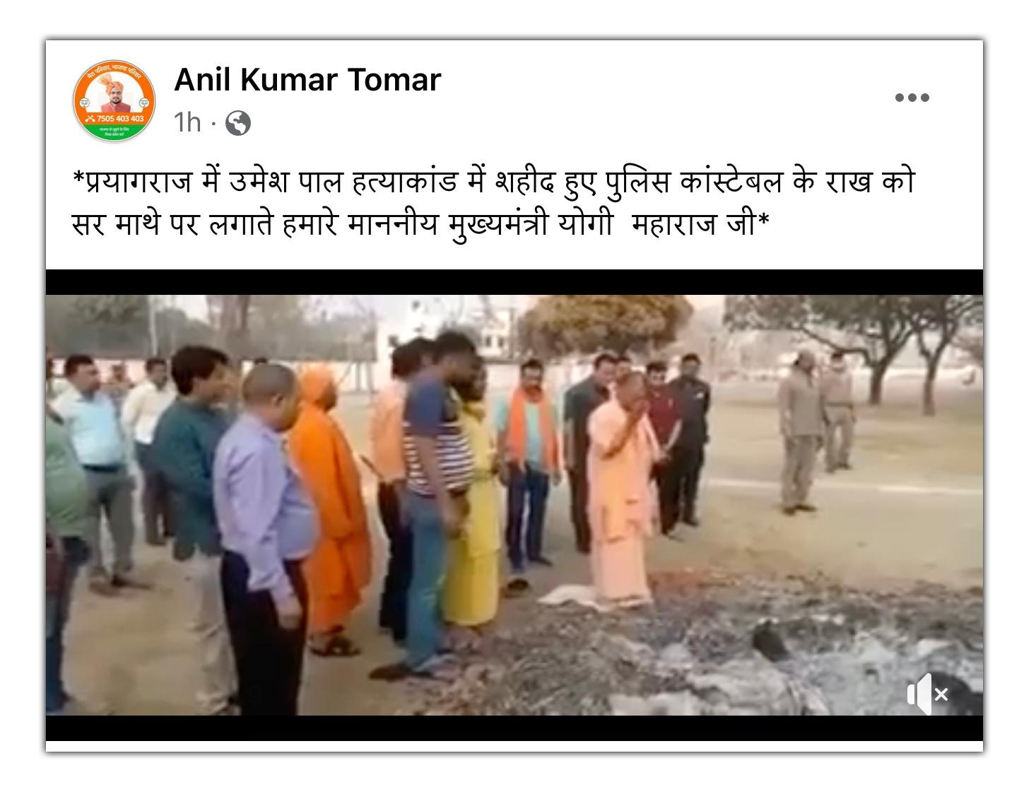 बीजेपी युवा मोर्चा (बागपत) के पूर्व जिला अध्यक्ष अनिल तोमर ने ये वीडियो शेयर करते हुए लिखा, "प्रयागराज में उमेश पाल हत्याकांड में शहीद हुए पुलिस कांस्टेबल के राख को सर माथे पर लगाते हमारे माननीय मुख्यमंत्री योगी महाराज जी."