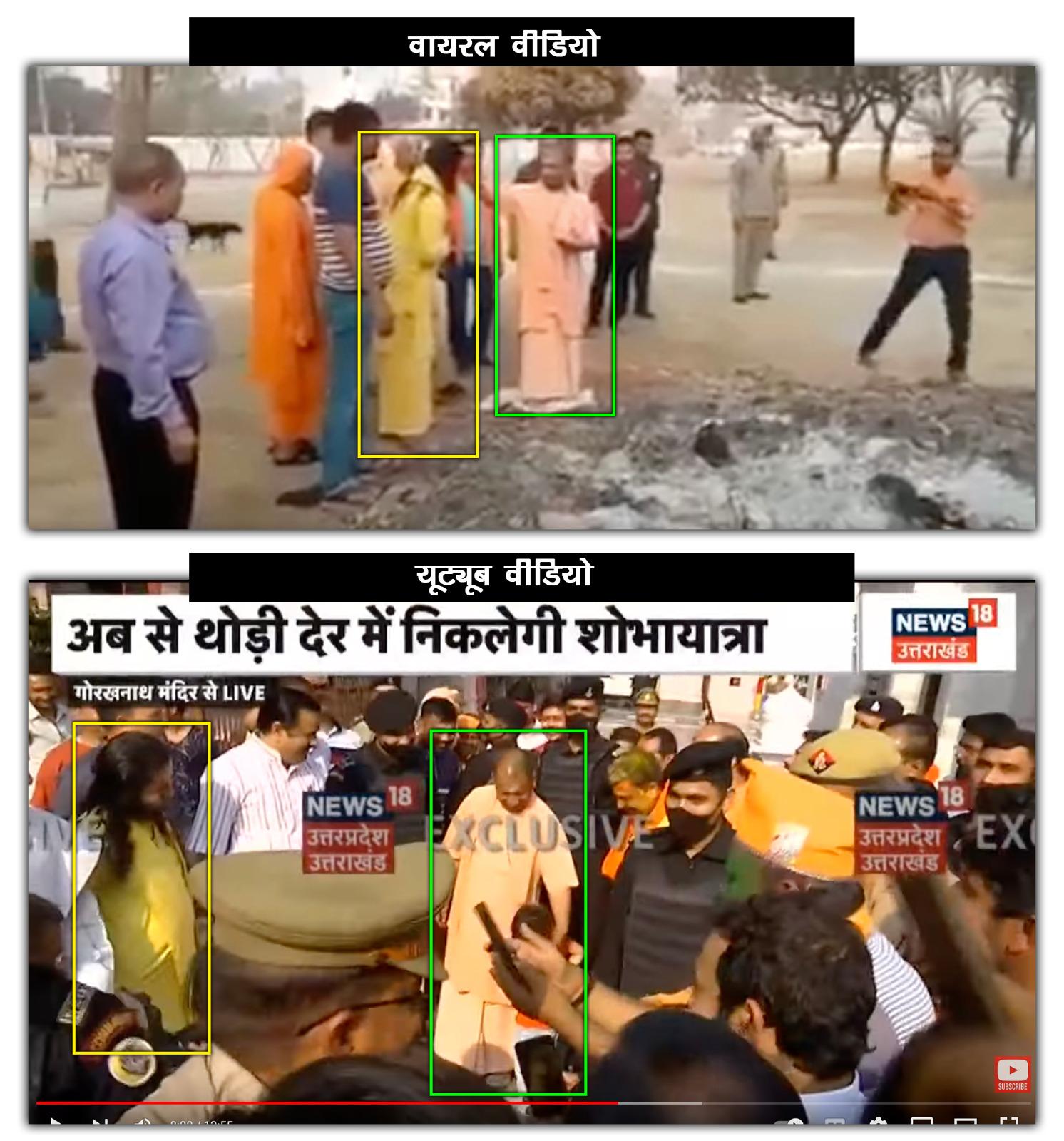 इसके बाद, हमने सीएम योगी के साल 2022 में होली मनाने से जुड़े और भी वीडियोज खोजे. ऐसा करने पर हमें 'न्यूज 18 उत्तराखंड' के यूट्यूब चैनल पर एक वीडियो मिला. वायरल वीडियो में दिख रहे पीले कपड़े पहने एक शख्स को इस वीडियो में भी देखा जा सकता है.