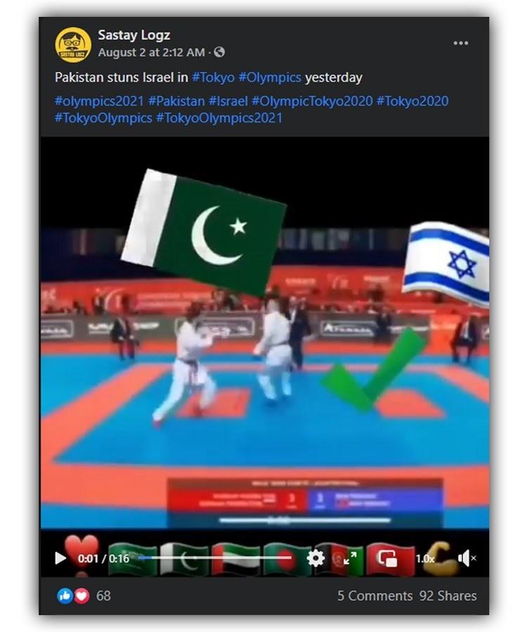 इस वीडियो को शेयर करते हुए एक फेसबुक यूजर ने लिखा, “कल टोक्यो ओलंपिक्स में पाकिस्तान ने इजरायल की सिट्टी-पिट्टी गुम कर दी.”