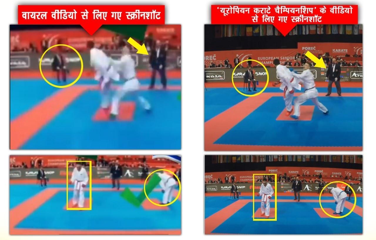 वायरल वीडियो वाला हिस्सा इस वीडियो में 1 मिनट 45 सेकंड पर देखा जा सकता है. वायरल हिस्से में रूस और मॉन्टेनीग्रो के खिलाड़ियों के बीच मुकाबला चल रहा था. हमने वायरल वीडियो के दो स्क्रीनशॉट्स की तुलना यूरोपियन कराटे चैम्पियनशिप के वीडियो से की. इसे देखकर समझा जा सकता है कि वायरल वीडियो इसी वीडियो से लिया गया है.