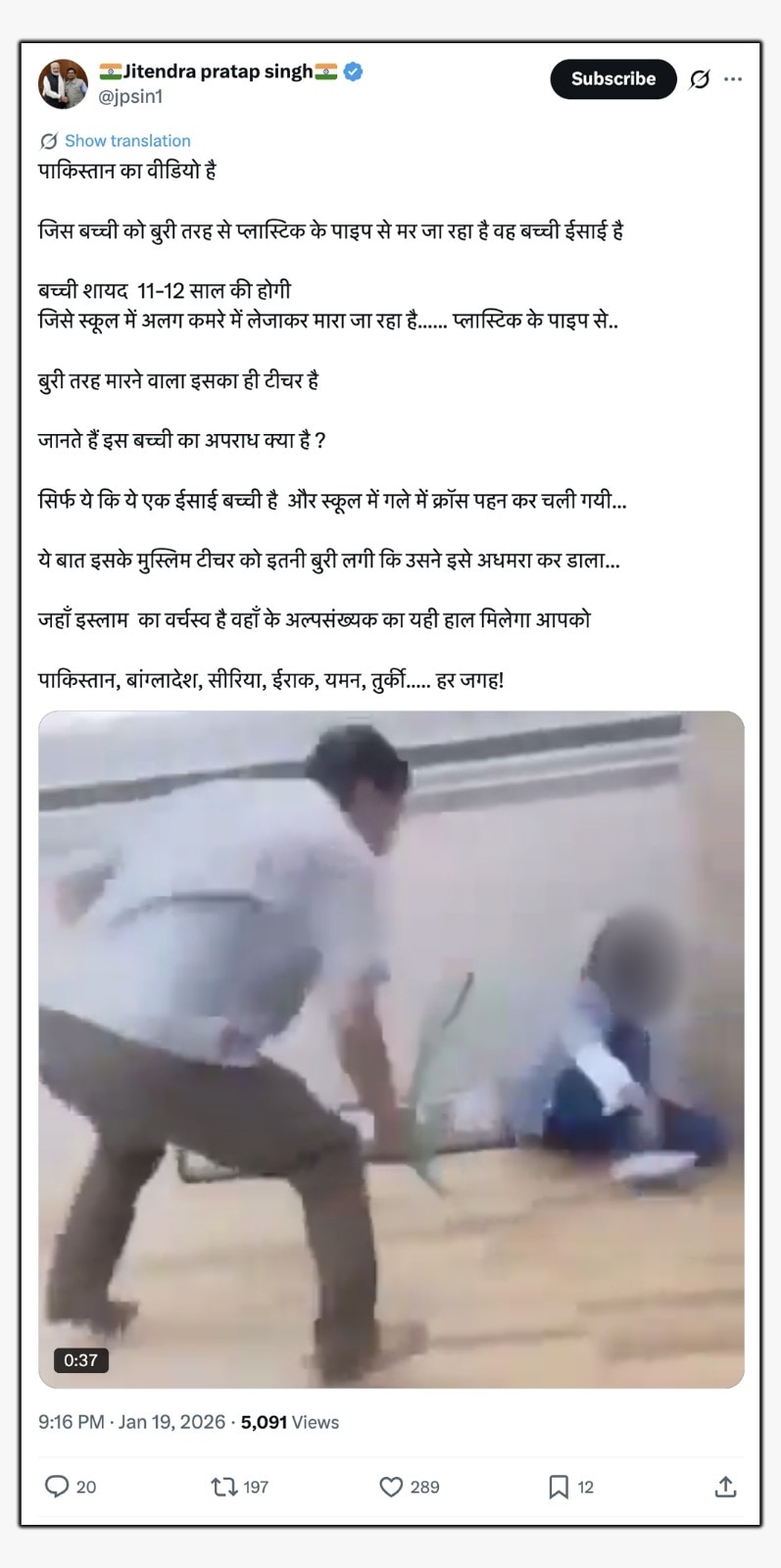 मिसाल के तौर पर एक्स पर एक व्यक्ति ने लिखा, “पाकिस्तान का वीडियो है. जिस बच्ची को बुरी तरह से प्लास्टिक के पाइप से मारा जा रहा है वह बच्ची ईसाई है. बच्ची शायद 11-12 साल की होगी जिसे स्कूल में अलग कमरे में ले जाकर मारा जा रहा है..प्लास्टिक के पाइप से..बुरी तरह मारने वाला इसका ही टीचर है.”