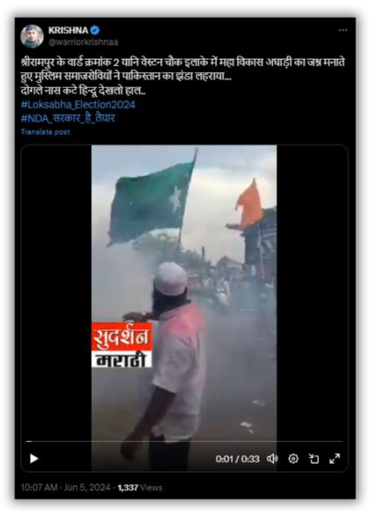 इसी बीच, सोशल मीडिया पर किसी शख्स को चांद-तारे वाला झंडा फहराते दिखाता एक वीडियो सोशल मीडिया पर खूब वायरल है. इसे शेयर करने वालों का दावा है कि ये महाराष्ट्र के श्रीरामपुर की घटना है, जहां ‘महा विकास अघाड़ी’ के उम्मीदवार की जीत के जश्न के दौरान पाकिस्तान का झंडा लहराया गया. कुछ इसी दावे के साथ इस वीडियो को सुरदर्शन न्यूज ने भी सोशल मीडिया प्लेटफॉर्म एक्स पर शेयर किया है.