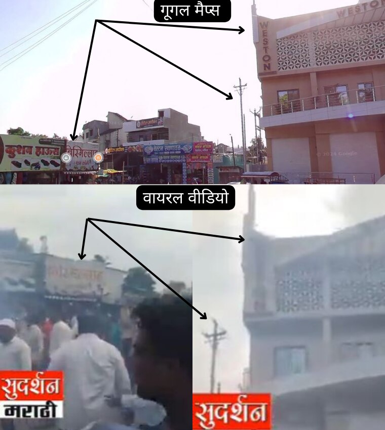 ज्यादा जानकारी के लिए हमने ये पता लगाने की कोशिश की कि ये घटना कहां की है. वीडियो में हमें एक दुकान के बोर्ड पर ‘बिस्मिल्लाह पान’ लिखा दिखाई दिया. इस जानकारी की मदद से हमने गूगल मैप्स पर श्रीरामपुर में इस दुकान को खोज निकाला. वीडियो में दिख रही एक ऊंची इमारत भी हमें इस लोकेशन पर दिखाई दी. इससे ये साफ हो जाता है कि ये जगह वही है जो वायरल वीडियो में दिख रही है.
