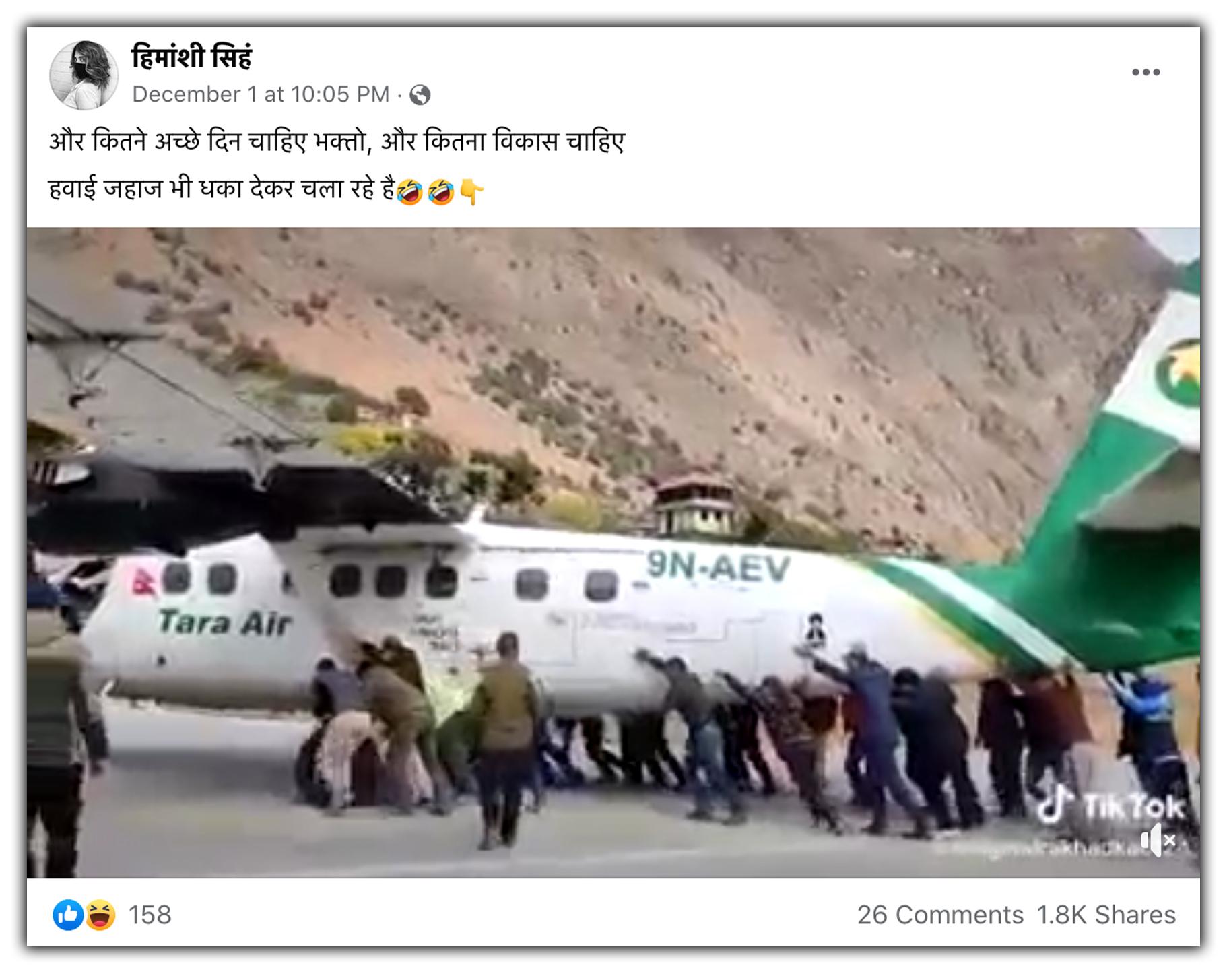 एक फेसबुक यूजर ने वीडियो के साथ कैप्शन में लिखा, "और कितने अच्छे दिन चाहिए भक्तो, और कितना विकास चाहिए हवाई जहाज भी धका देकर चला रहे है". इस पोस्ट को अभी तक लगभग दो हजार बार शेयर किया जा चुका है. इसी कैप्शन के साथ कुछ और लोगों ने भी इस वीडियो को फेसबुक पर पोस्ट किया है.क्या है सच्चाई? इंडिया टुडे ने अपनी जांच में पाया कि वीडियो के साथ किया जा रहा दावा भ्रामक है. यह भारत का नहीं बल्कि नेपाल का हाल ही का वीडियो है. असल में पिछले कुछ दिनों से यह वीडियो सोशल मीडिया पर काफी चर्चा में है. इसको लेकर कई खबरें भी प्रकाशित हो चुकी हैं. "एनडीटीवी" की खबर के अनुसार, यह वीडियो 1 दिसंबर 2021 का है जब नेपाल के बाजुरा एयरपोर्ट पर लैंडिंग के दौरान इस प्लेन का पिछला टायर फट गया था. इस वजह से हवाई जहाज रनवे से हट नहीं पा रहा था. इसी वजह से एयरपोर्ट पर मौजूद यात्रियों ने प्लेन को धक्का लगा कर रनवे से हटाया था. दरअसल, अगर हवाई जहाज को रनवे से नहीं हटाया जाता तो दूसरे विमान की लैंडिंग नहीं हो पाती. यह विमान नेपाल की "तारा एयरलाइंस" का था.