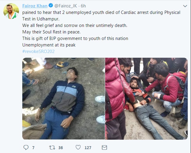 कांग्रेस नेता फिरोज खान का एक ट्वीट इन दिनों वायरल हो रहा है, जिसमें दावा किया गया है कि जम्मू-कश्मीर के उधमपुर में हुए फिजिकल टेस्ट (शारीरिक दमखम का परीक्षण) में दो युवकों की दिल का दौरा पड़ने से मौत हो गई. खान नेशनल स्टूडेंट्स यूनियन ऑफ इंडिया (एनएसयूआई) के राष्ट्रीय अध्यक्ष भी रह चुके हैं.