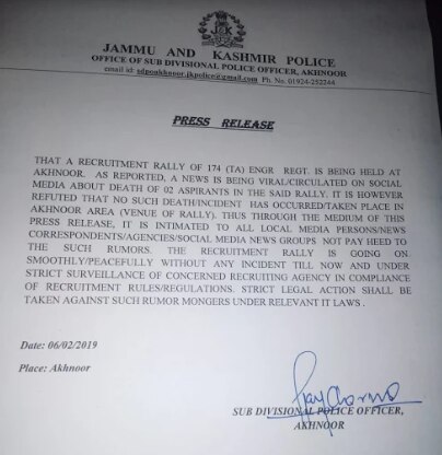 उधमपुर से करीब 90 किलोमीटर दूर अखनूर में 174 (टीए) इंजीनियर रेजिमेंट की भर्ती के लिए रिक्रूटमेंट रैली जारी है. हालांकि यहां से भी इस तरह की कोई घटना रिपोर्ट नहीं हुई है. सोशल मीडिया पर फैलाई जा रही इस अफवाह के मद्देनजर अखनूर के सब—डिवीजनल पुलिस ऑफिसर के ऑफिस ने बुधवार को एक प्रेस नोट जारी किया. इसमें मीडिया और सोशल मीडिया पर मौजूद न्यूज ग्रुप्स को इन अफवाहों पर ध्यान नहीं देने की अपील की गई.