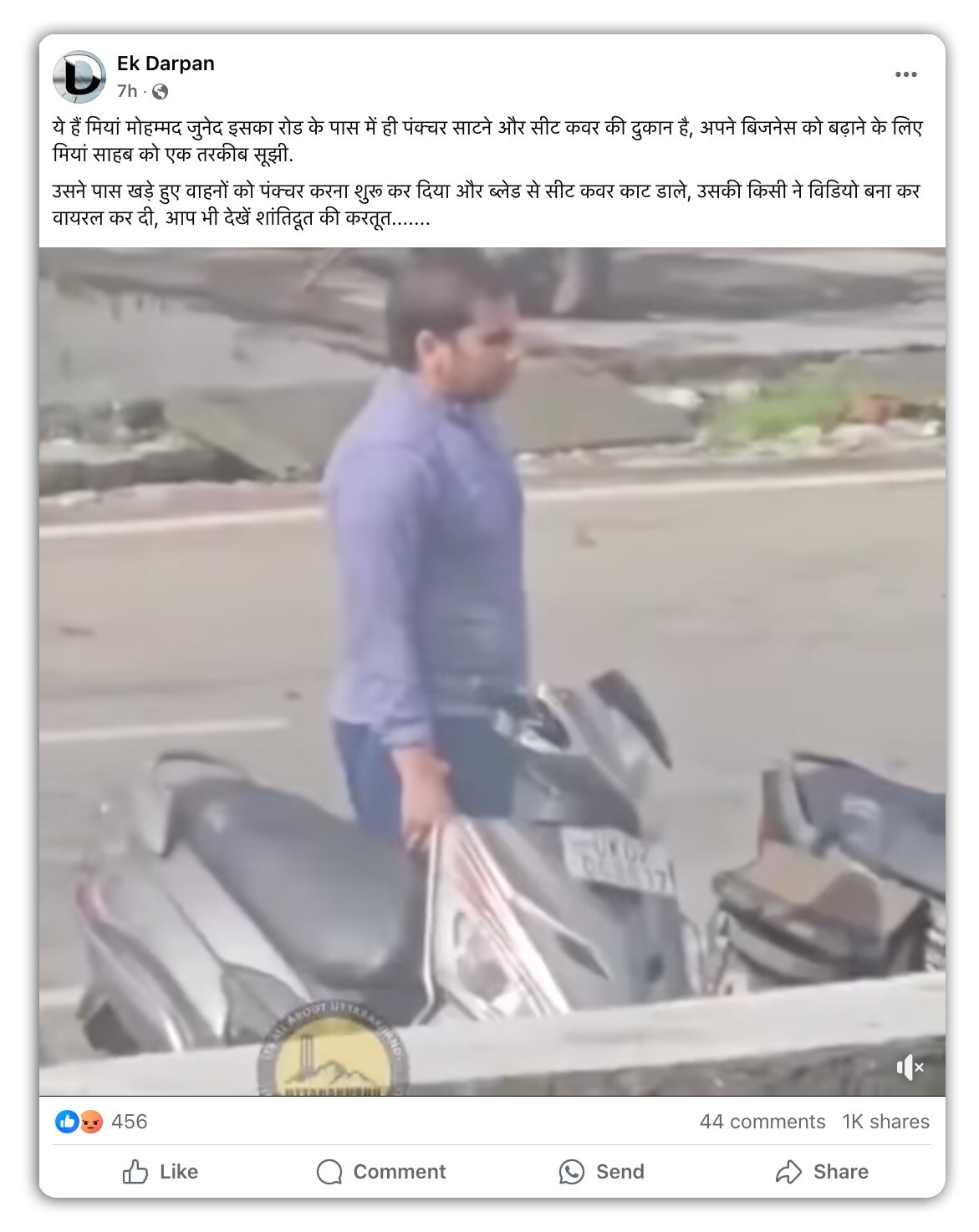 कई लोगों का कहना है कि ये एक मुस्लिम पंचरवाला है जो जानबूझकर ऐसा करता है ताकि लोग उसकी दुकान से सीट कवर बदलवाएं और पंचर बनवाएं. मिसाल के तौर पर, एक फेसबुक यूजर ने ये वीडियो पोस्ट करते हुए लिखा, “ये हैं मियां मोहम्मद जुनेद इसका रोड के पास में ही पंक्चर साटने और सीट कवर की दुकान है, अपने बिजनेस को बढ़ाने के लिए मियां साहब को एक तरकीब सूझी. उसने पास खड़े हुए वाहनों को पंक्चर करना शुरू कर दिया और ब्लेड से सीट कवर काट डाले, उसकी किसी ने विडियो बना कर वायरल कर दी, आप भी देखें शांतिदूत की करतूत.”