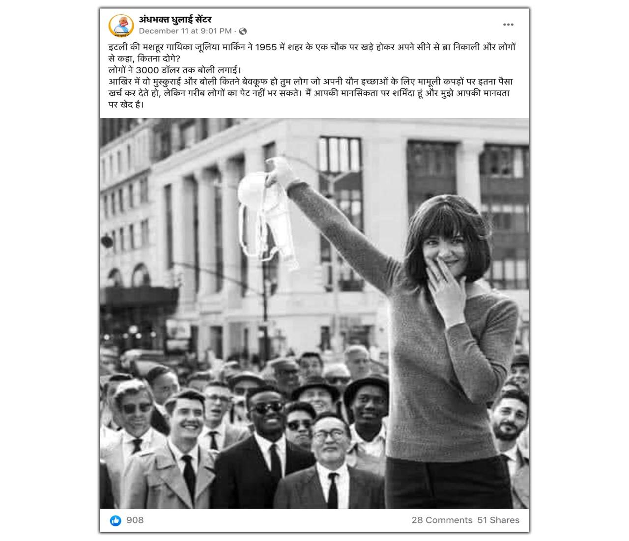 इस फोटो के साथ दावा किया जा रहा है कि "ये इटली की मशहूर गायिका जूलिया मार्किन की फोटो है जिन्होंने 1955 में एक चौक पर अपनी ब्रा निकालकर लोगों से पूछा था कि वो इसकी क्या कीमत देंगे? लोग ब्रा खरीदने के लिए 3000 डॉलर तक देने को तैयार हो गए थे. इस पर जूलिया ने लोगों से मुस्कुरा कर कहा था कि वो कितने नासमझ हैं कि अपनी यौन इच्छाओं के लिए मामूली कपड़ों पर इतना पैसा खर्च कर रहे हैं. इन पैसों से गरीबों का पेट भी भरा जा सकता है." यह पोस्ट फेसबुक और ट्विटर पर खूब शेयर की जा रही है.