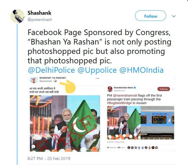 यूज़र ने यह भी दावा किया कि फेसबुक पर इस पोस्ट को 'भाषण या राशन' पेज ने स्पांसर भी किया था. इंडिया टुडे एंटी फेक न्यूज़ वॉर रूम की तफ्तीश से ये साफ़ हो जाता है कि प्रधानमंत्री की तस्वीर के साथ छेड़छाड़ की गई.