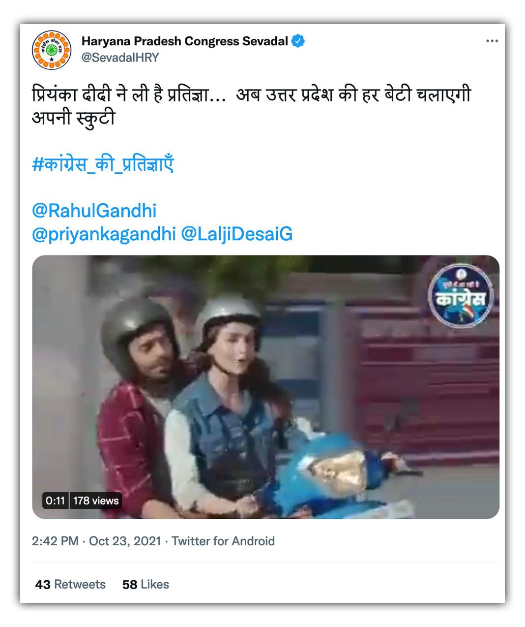 ‘हरियाणा प्रदेश कांग्रेस सेवादल’ ने ये वीडियो ट्विटर पर शेयर करते हुए लिखा, “प्रियंका दीदी ने ली है प्रतिज्ञा... अब उत्तर प्रदेश की हर बेटी चलाएगी अपनी स्कुटी #कांग्रेस_की_प्रतिज्ञाएँ”.
