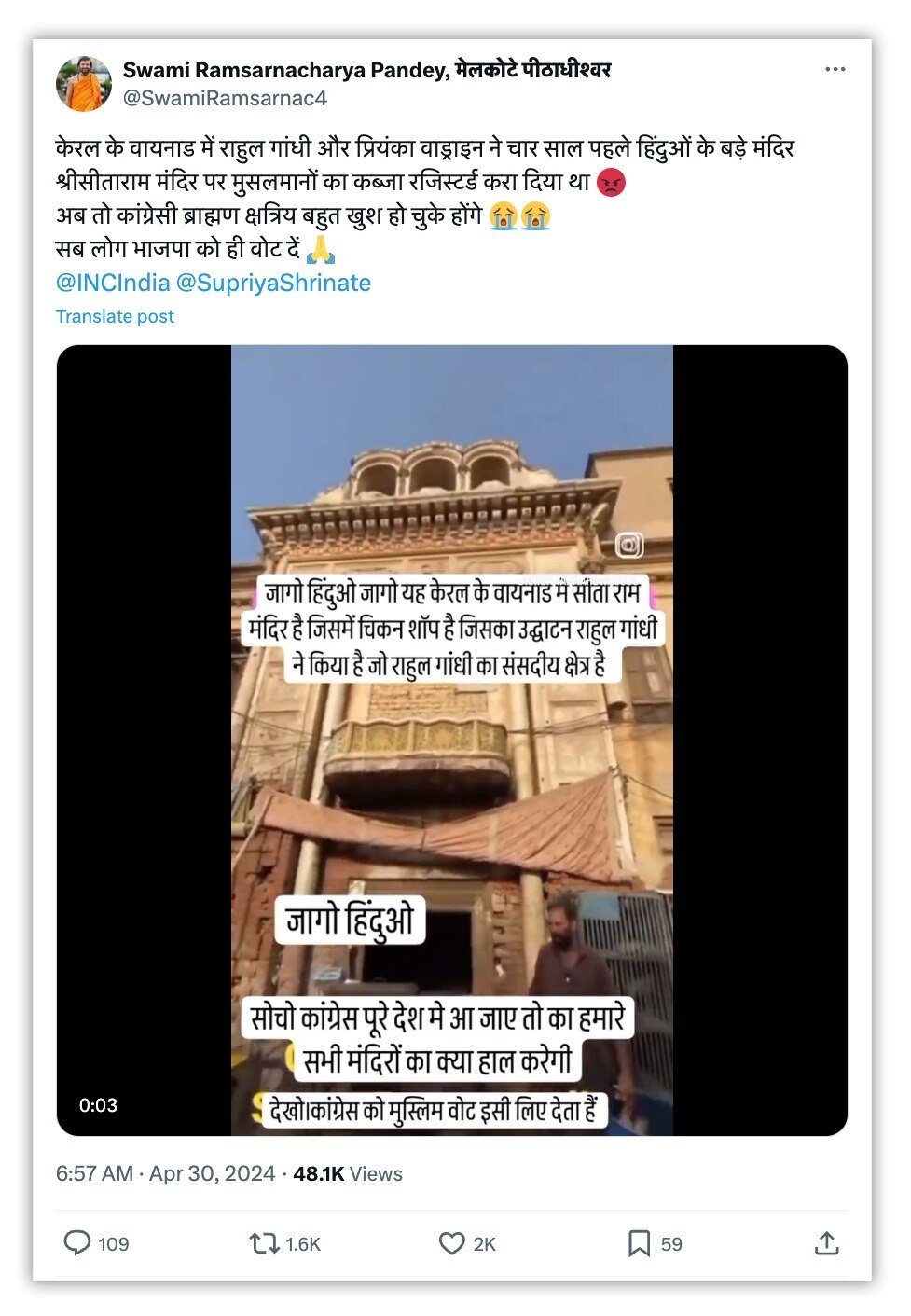 वायरल वीडियो को शेयर करते हुए एक यूजर ने लिखा, “केरल के वायनाड में राहुल गांधी और प्रियंका वाड्राइन ने चार साल पहले हिंदुओं के बड़े मंदिर श्रीसीताराम मंदिर पर मुसलमानों का कब्जा रजिस्टर्ड करा दिया था. अब तो कांग्रेसी ब्राह्मण क्षत्रिय बहुत खुश हो चुके होंगे. सब लोग भाजपा को ही वोट दें.” ऐसे ही एक वायरल पोस्ट का आर्काइव्ड लिंक यहां देखा जा सकता है.”
