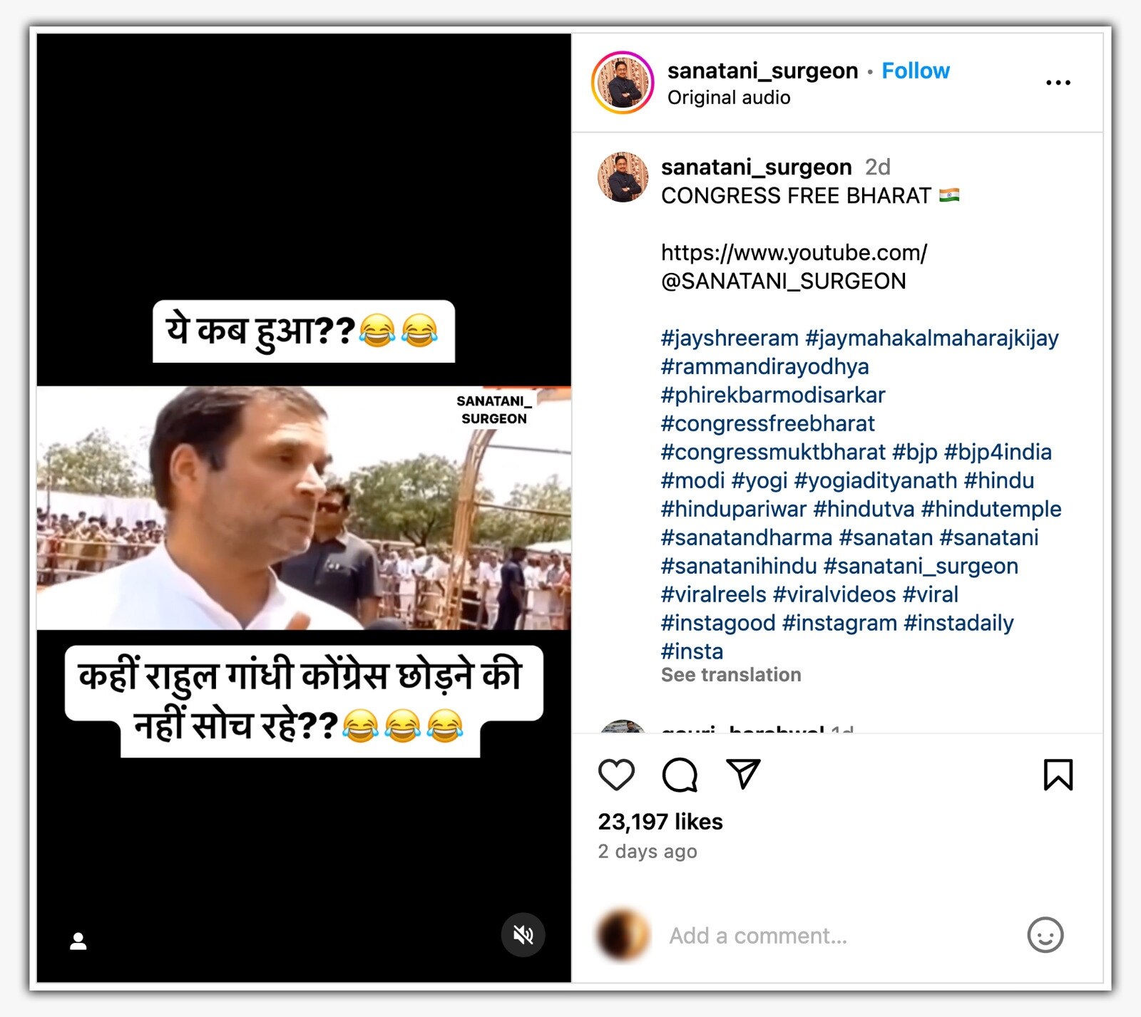 इस वीडियो को शेयर करते हुए सोशल मीडिया यूजर्स राहुल गांधी पर तंज कस रहे हैं कि कहीं वो भी बीजेपी तो नहीं जॉइन करने जा रहे हैं. लोग वीडियो पर कमेंट कर रहे हैं कि राहुल ने पहली बार सही बात बोली है. इंस्टाग्राम पर ये वीडियो काफी वायरल है. वायरल पोस्ट का आर्काइव्ड वर्जन यहां देखा जा सकता है.