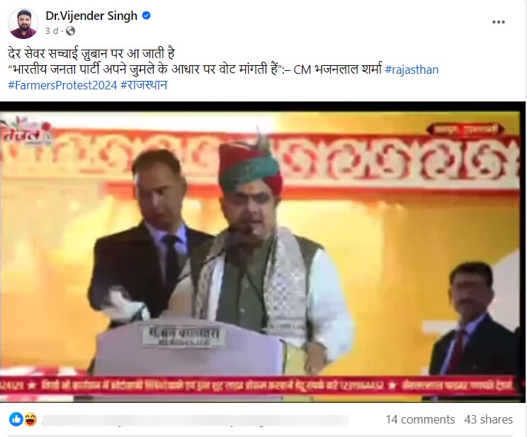 भजनलाल शर्मा का ये वीडियो कब का और कहां का है, ये पता करने के लिए हमने उनके पिछले कुछ भाषणों के वीडियो चेक किए. भजनलाल के फेसबुक पेज पर हमें एक वीडियो मिला, जिसमें उन्होंने ठीक वैसे ही कपड़े और पगड़ी पहन रखी है जैसा कि वायरल वीडियो में दिखता है.