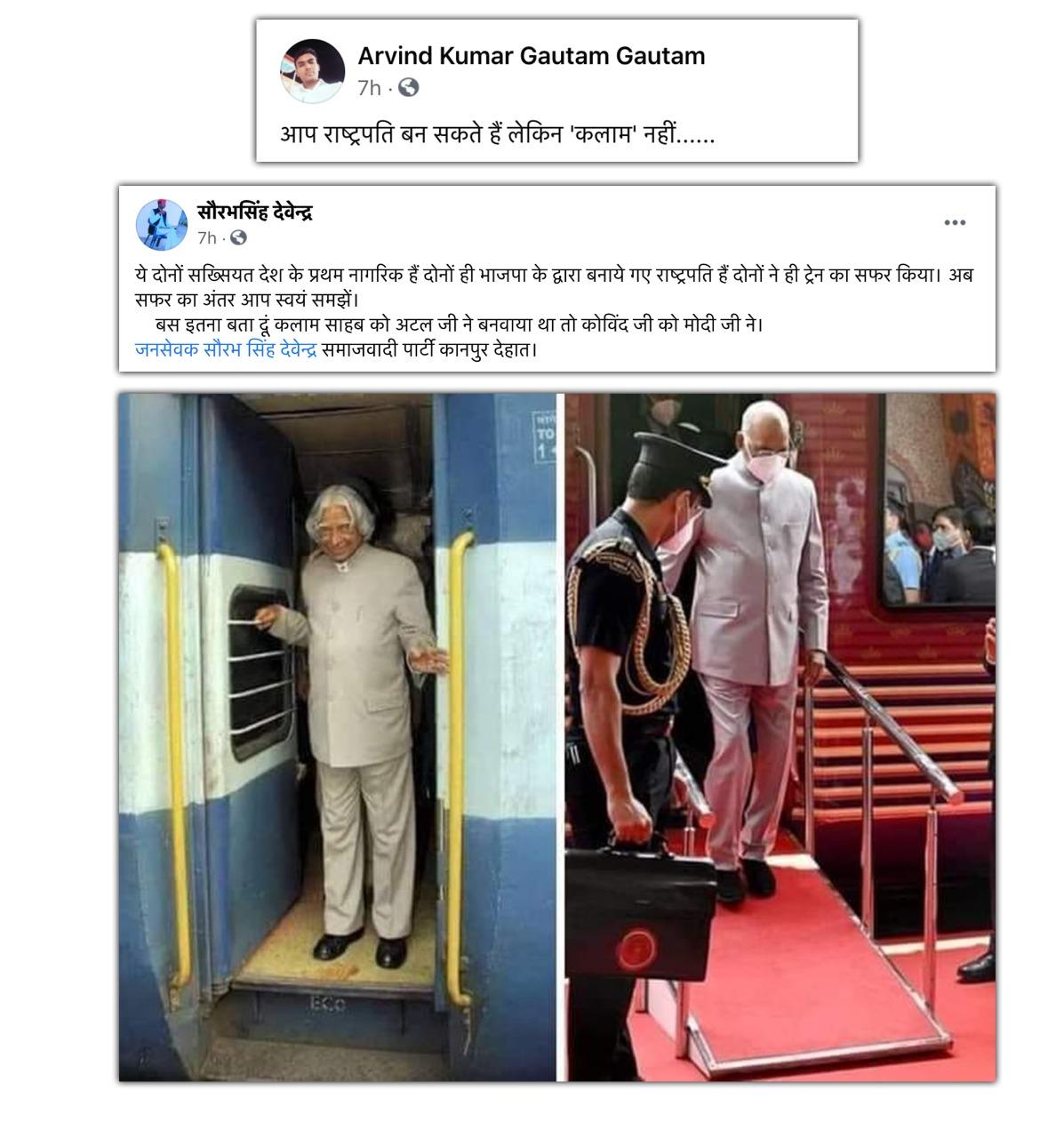 इन तस्वीरों के जरिये ये बताने की कोशिश की जा रही है कि राष्ट्रपति रहते हुए दोनों ने ट्रेन से सफर किया, लेकिन कोविंद ने विशेष सुविधाओं से लैस ट्रेन में सवारी की, वहीं अपनी सादगी के लिए मशहूर कलाम ने एक साधारण ट्रेन से सफर किया. इन तस्वीरों को शेयर करते हुए यूजर्स अलग-अलग कैप्शन लिख रहे हैं. एक व्यक्ति ने कैप्शन में लिखा है, "आप राष्ट्रपति बन सकते हैं लेकिन 'कलाम' नहीं......". ये पोस्ट फेसबुक और ट्विटर पर काफी वायरल हो रही है.
