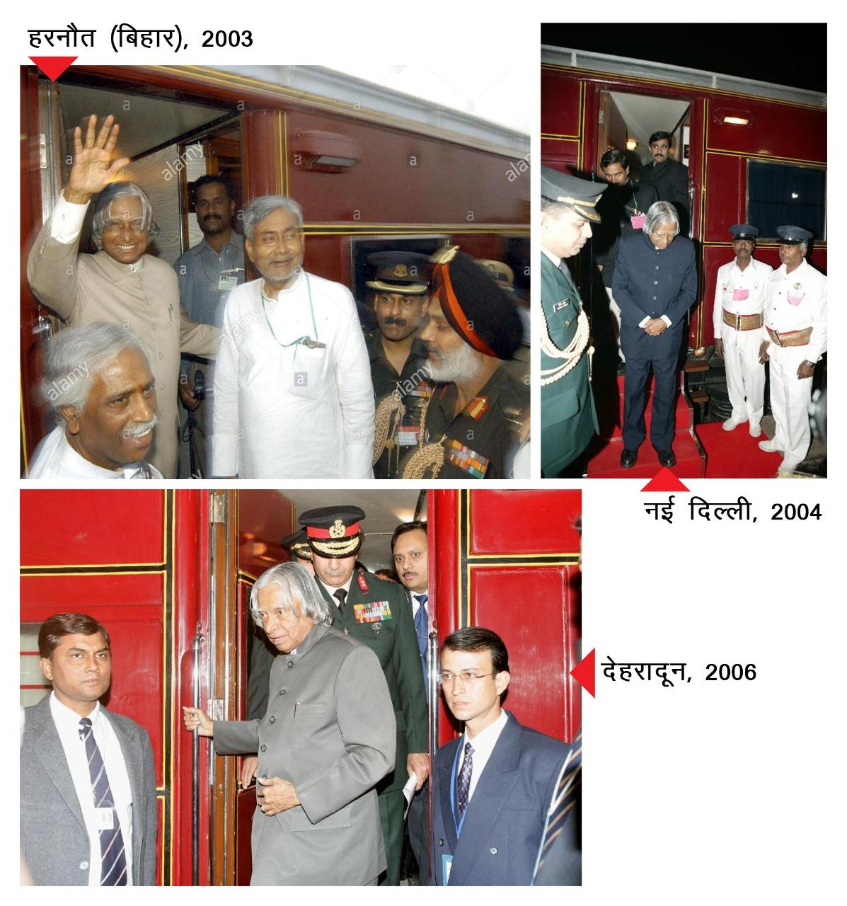 खोजने पर हमें अब्दुल कलाम की भी कुछ तस्वीरें मिलीं जिसमें वे विशेष ट्रेन या "प्रेसिडेंशियल सलून" के गेट पर देखें जा सकते हैं. ये तस्वीरें अलग-अलग रेलवे स्टेशन की और अलग-अलग साल की हैं, जब डॉ कलाम ने विशेष ट्रेन का इस्तेमाल किया था. ये तस्वीरें हमें