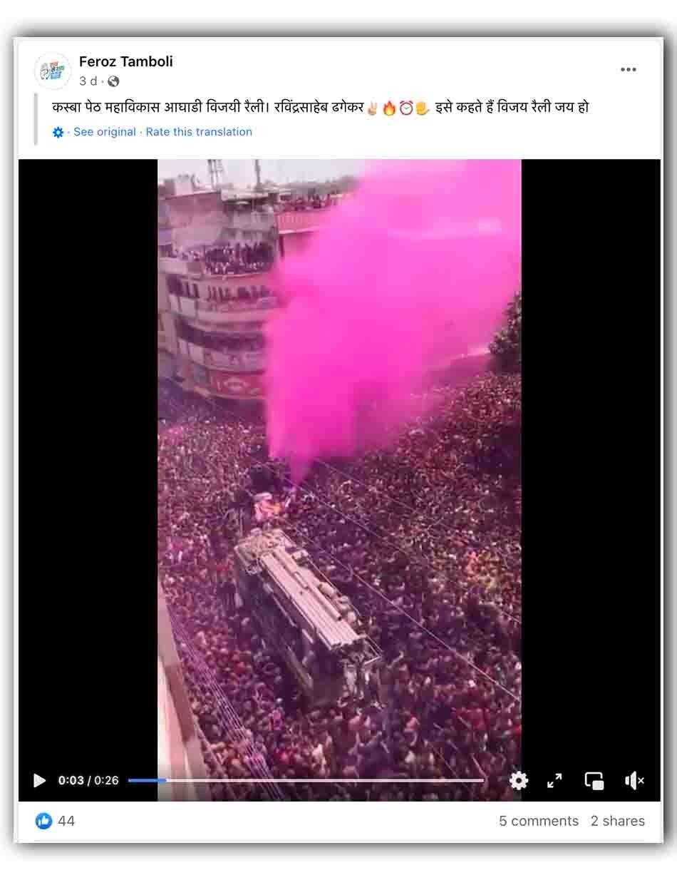 एक फेसबुक यूजर ने इस वीडियो को शेयर करते हुए लिखा, “कस्बा पेठ महाविकास आघाडी विजयी रैली. रविंद्रसाहेब ढगेकर इसे कहते हैं विजय रैली जय हो.”