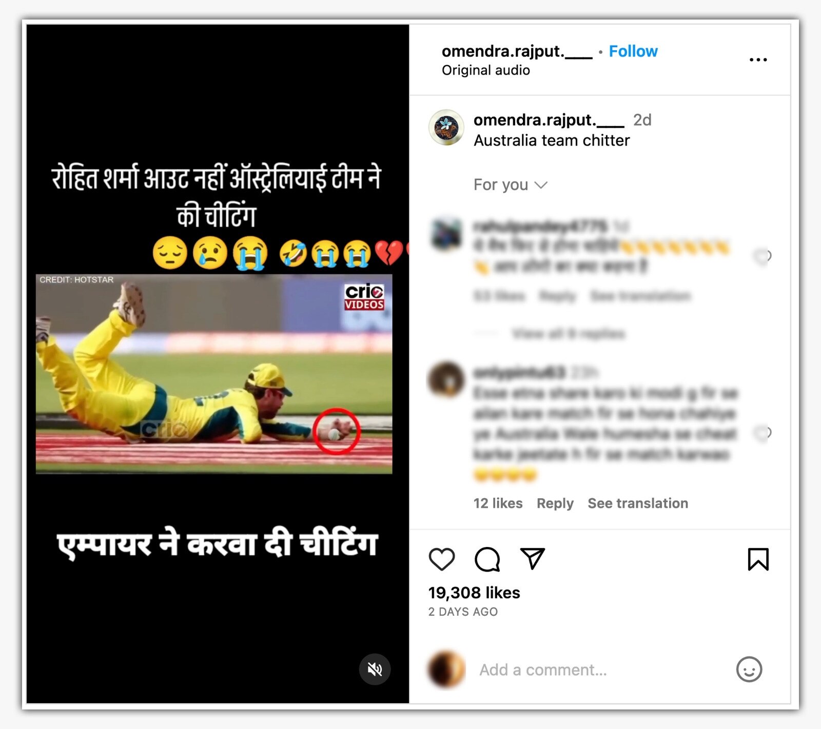ये तस्वीर है ऑस्ट्रेलिया के खिलाड़ी ट्रेविस हेड की, जिन्होंने भारतीय कप्तान रोहित शर्मा का कैच पकड़कर भारत को बड़ा झटका दिया था. हालांकि, वायरल फोटो में गेंद को ट्रेविस के हाथ से छूटकर ग्राउंड को छूते हुए देखा जा सकता है. इसे शेयर करते हुए लोग ऑस्ट्रेलिया के खिलाड़ियों और अंपायर पर टीम इंडिया के साथ बेईमानी करने का आरोप लगा रहे हैं. साथ ही कह रहे हैं कि रोहित आउट नहीं हुए थे. ऐसे ही एक पोस्ट का आर्काइव्ड वर्जन यहां देखा जा सकता है.