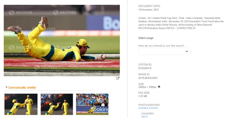 इस बात को और पुख्ता करने के लिए हमने ‘रॉयटर्स’ की फोटो गैलरी में कीवर्ड सर्च करके इस फोटो को ढूंढ निकाला. यहां इसे 19 नवंबर को शेयर करते हुए बताया गया है कि ये फोटो भारत और ऑस्ट्रेलिया के बीच अहमदाबाद के नरेंद्र मोदी स्टेडियम में हुए वर्ल्ड कप 2023 के फाइनल मैच की है. तस्वीर में ऑस्ट्रेलिया के खिलाड़ी ट्रेविस हेड को ग्लेन मैक्सवेल की बॉल पर रोहित शर्मा का कैच पकड़ते देखा जा सकता है. ‘रॉयटर्स’ पर अपलोड हुई इस असली तस्वीर में भी गेंद जमीन से थोड़ी ऊंचाई पर ट्रेविस के हाथों में दिखती है.