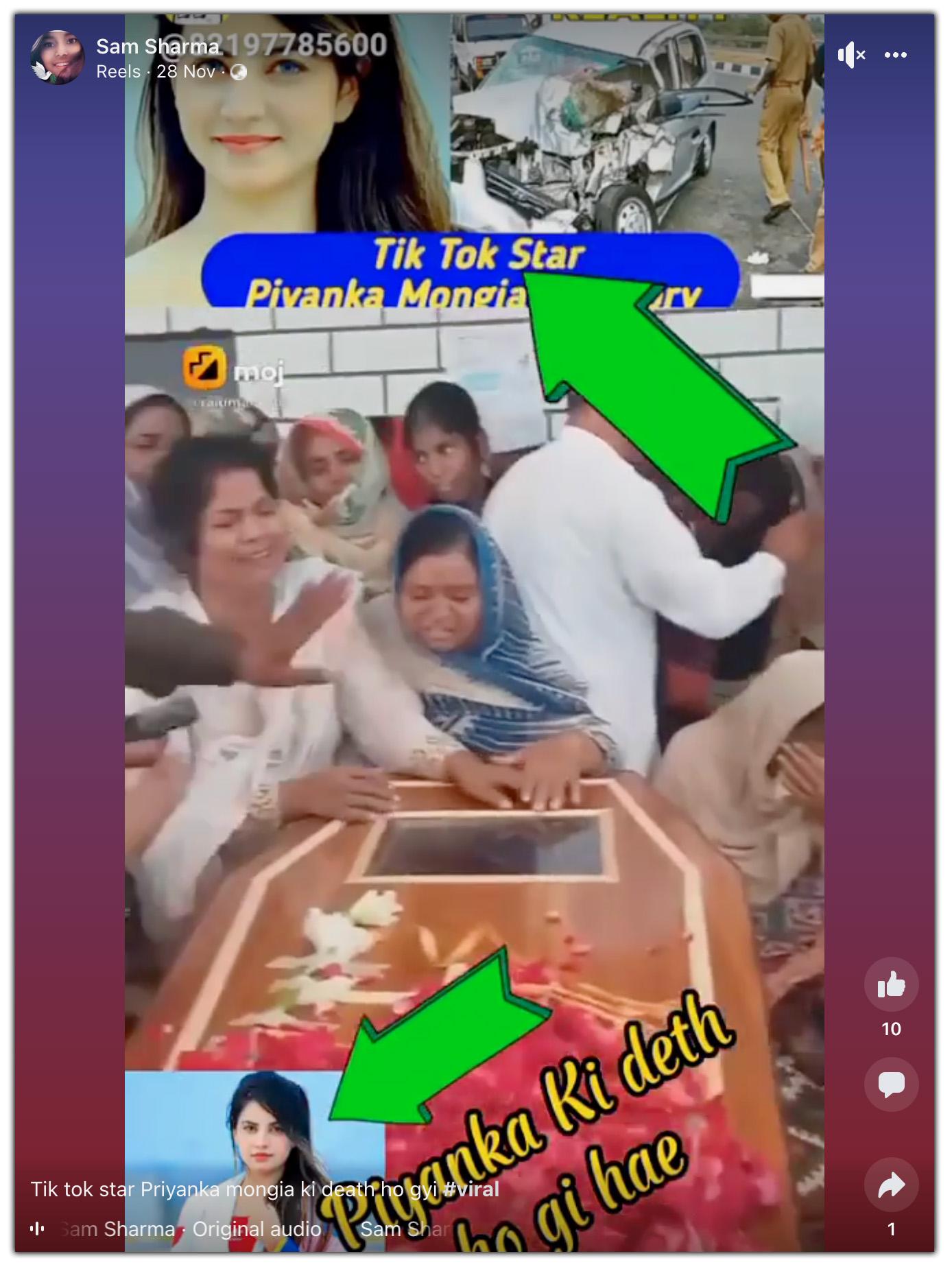 एक फेसबुक यूजर ने इस वीडियो को पोस्ट करते हुए लिखा, "टिकटॉक स्टार पियांका मोंगिया की मौत हो गई".