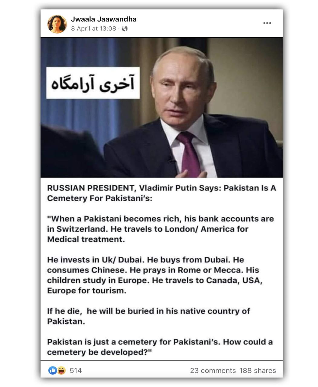 सोशल मीडिया पर रूसी राष्ट्रपति व्लादिमीर पुतिन के हवाले से एक हैरान कर देने वाला बयान वायरल हो रहा है. इसमें लिखा है कि हर सफल पाकिस्तानी नागरिक विदेशी सुख-सुविधाओं को ही तवज्जो देता है और उसके लिए अपने देश का वजूद एक कब्रिस्तान से ज्यादा नहीं है.