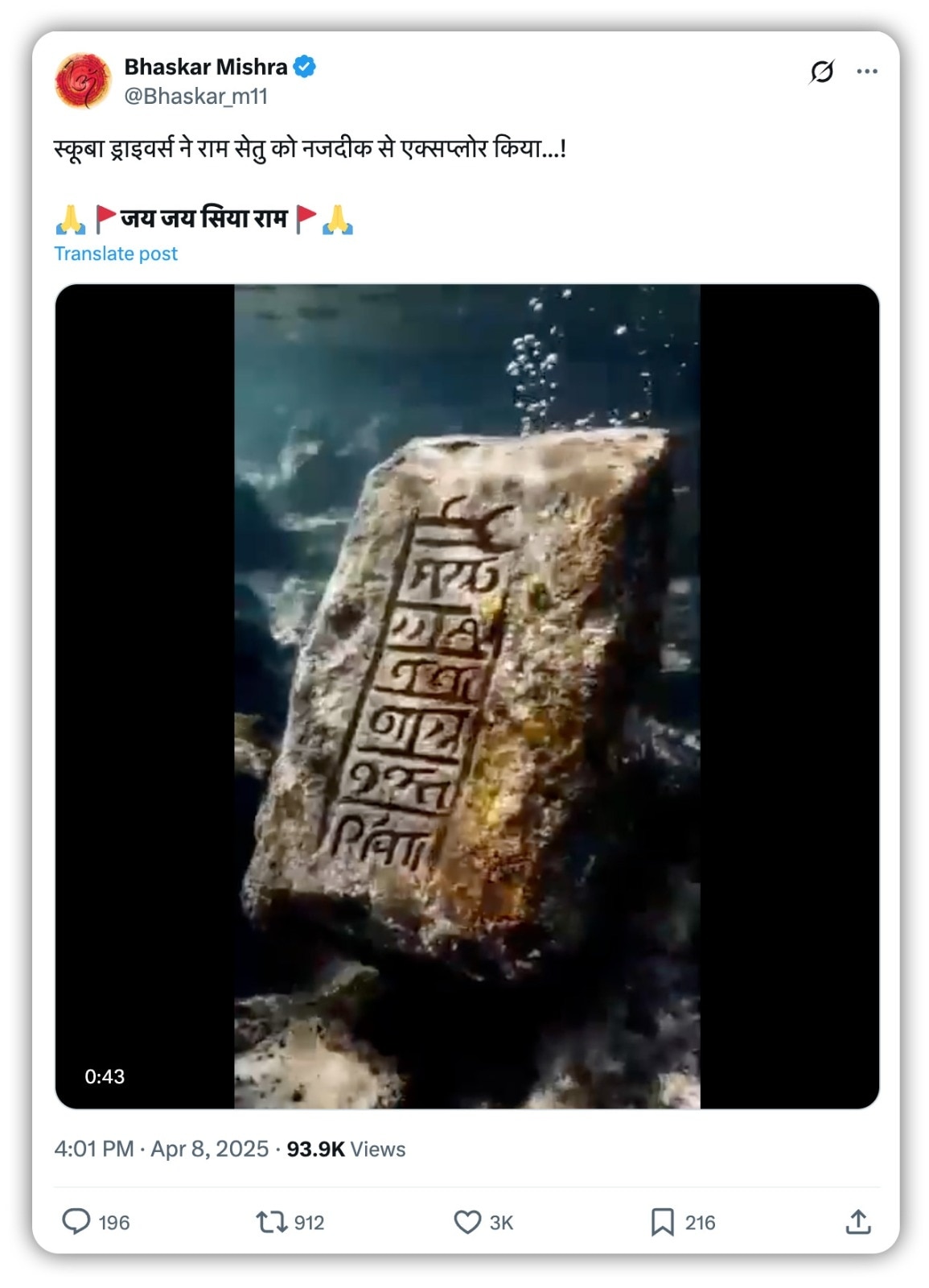 एक एक्स यूजर ने लिखा, “स्कूबा ड्राइवर्स ने राम सेतु को नजदीक से एक्सप्लोर किया, जय जय सिया राम.”