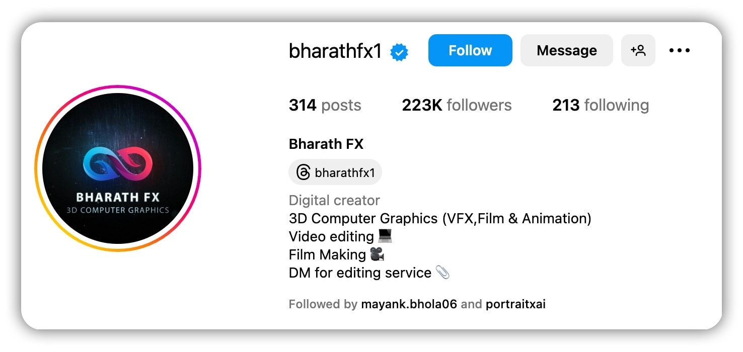 हमने bharathfx1 के इंस्टाग्राम अकाउंट को खंगाला तो पाया कि यहां वायरल वीडियो से मिलती जुलती और भारतीय इतिहास, धर्म और संस्कृति से जुड़ी कई AI-जनरेटेड वीडियो मौजूद हैं. अकाउंट के बायो में दी गई जानकारी के मुताबिक, इन वीडियोज को बनाने वाले आर्टिस्ट का नाम Bharath FX है और वे 3डी कंप्यूटर ग्राफिक्स, VFX, एनीमेशन, वीडियो एडिटिंग का काम करते हैं.