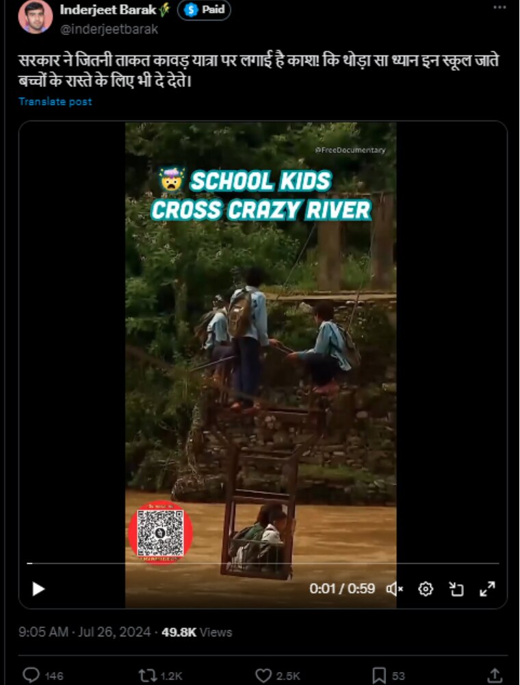 सोशल मीडिया पर ये वीडियो शेयर करते हुए एक व्यक्ति ने लिखा, “सरकार ने जितनी ताकत कावड़ यात्रा पर लगाई है काश! कि थोड़ा सा ध्यान इन स्कूल जाते बच्चों के रास्ते के लिए भी दे देते.” इस वीडियो के जवाब में कई लोग सरकार को घेरते हुए आरोप लगा रहे हैं कि बच्चे वोट नहीं डाल सकते, इसलिए सरकार उनके लिए काम नहीं करती.